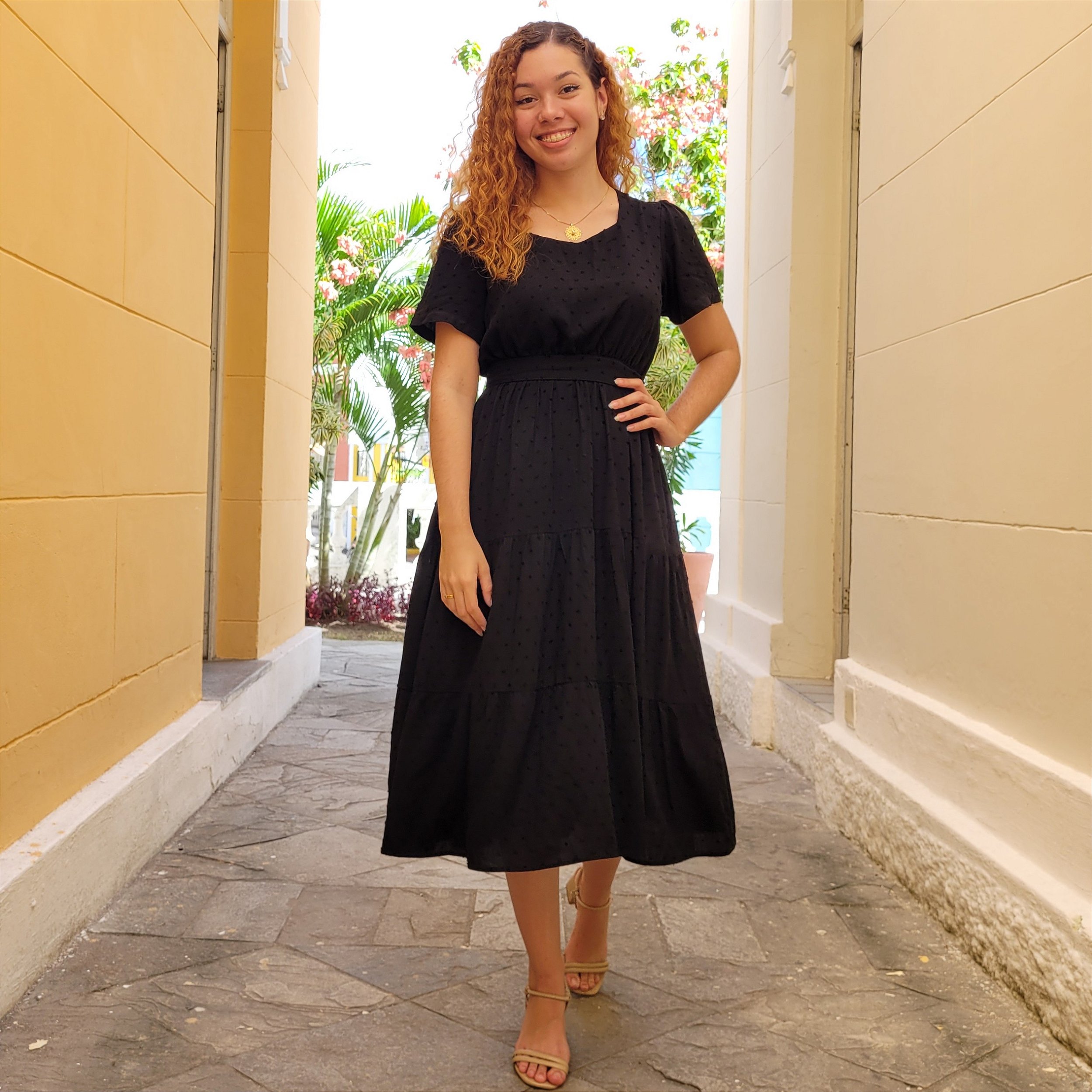 OBS.: O vestido é soltinho e possui elástico, portanto ele se adapta às suas medidas. Escolha o tamanho mais próximo das suas medidas, pois não precisam ser exatas.