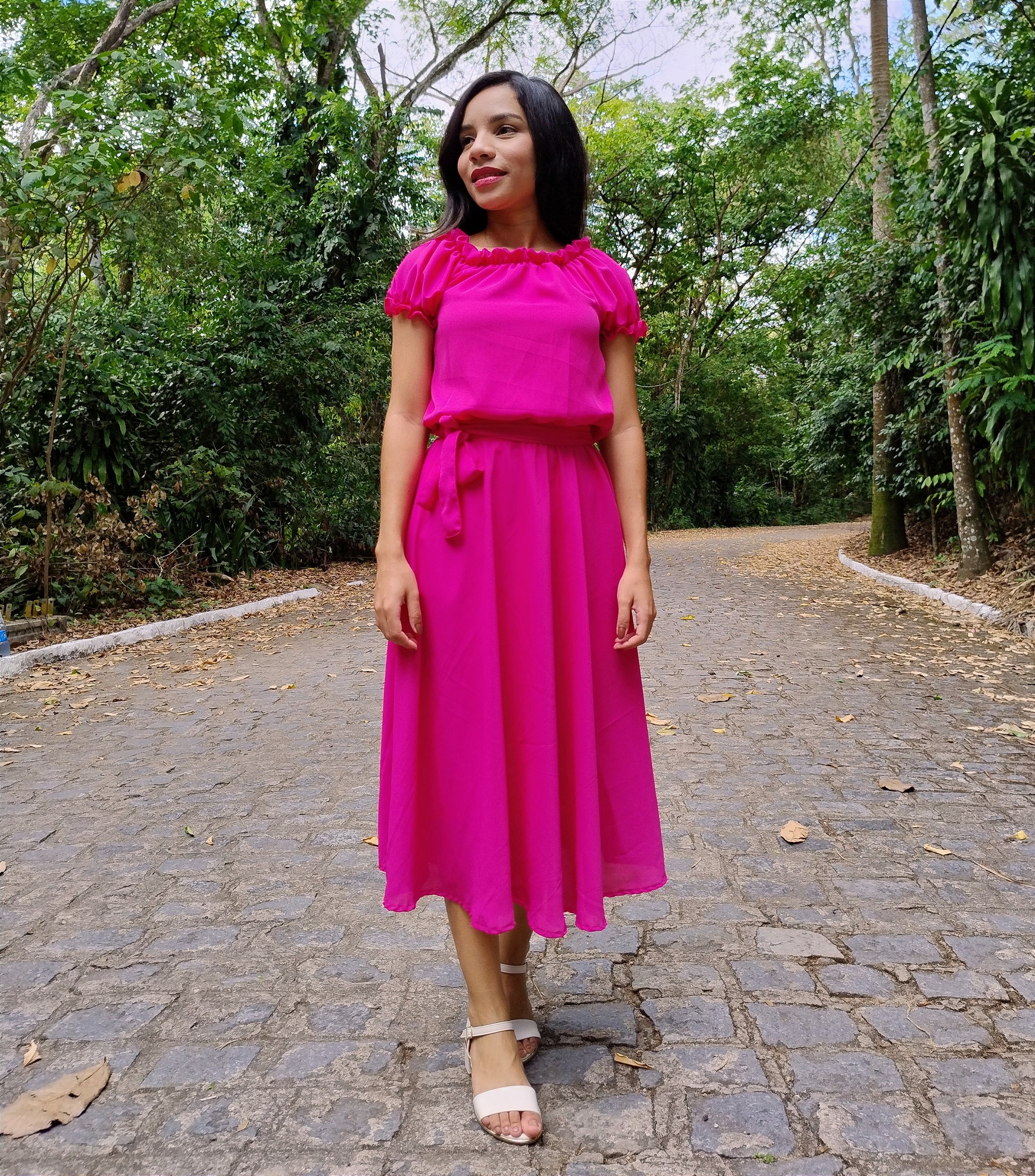 Vestido soltinho em crepe com elástico no decote, na cintura e nas mangas, saia godê, possui forro. Não possui bolsos e acompanha faixa para a cintura.